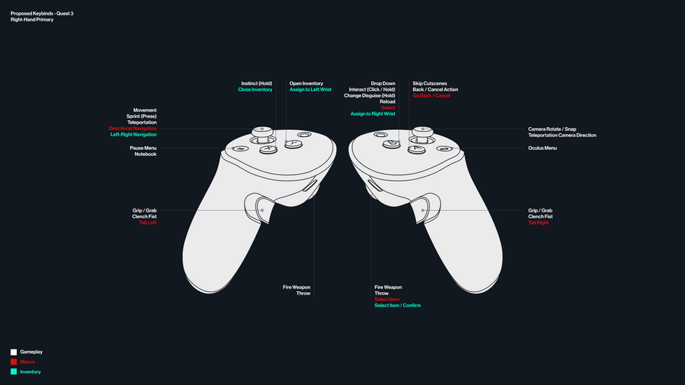 To capture the essence and experience of Agent 47 in VR, my time on this project was spent reviewing existing Hitman 3 features and looking at how it could best function in VR, both in experience and accessibility, including things like displaying the flatscreen hud UI through a watch instead, and re-designing the inventory and all other main menu screens to work for point and click.​